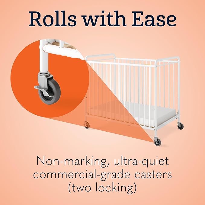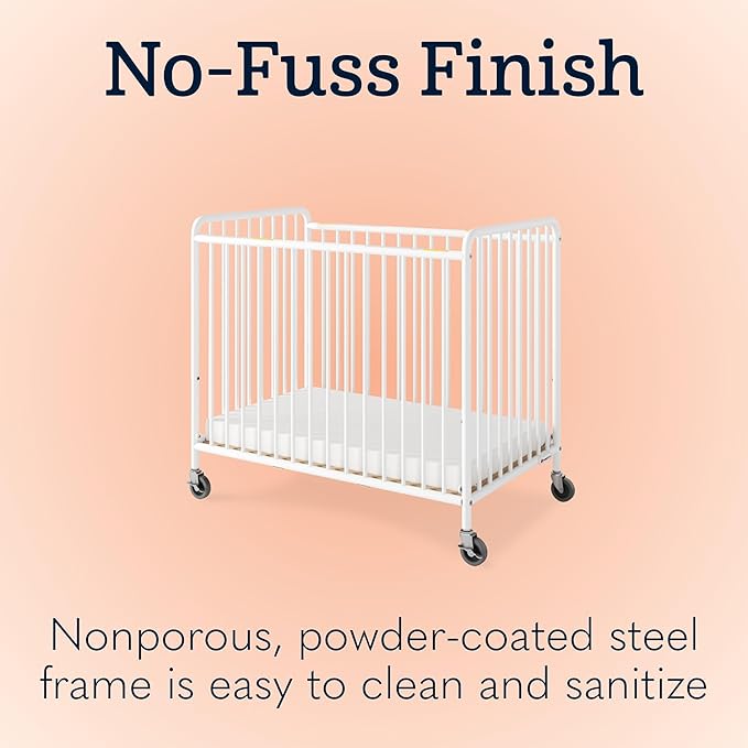 Foundations Chelsea Slatted Metal Compact Daycare Crib, 3" Casters, Compact Mini Size, Easy to Clean Durable Finish, Adjustable to Two Heights Mattress Board (White)