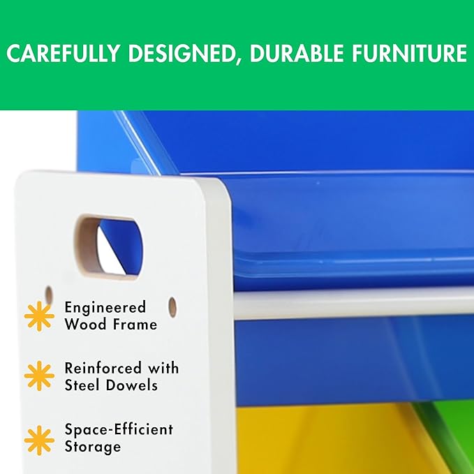 - Durable & Safe Construction – Sturdy engineered wood frame with steel dowels ensures long-lasting strength and stability; bins are BPA- and phthalate-free for added safety.