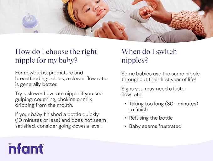- FIND YOUR FLOW - Flow is unique to every baby. Each nfant nipple is self-venting to allow the nipple to stay full of milk or formula while baby is feeding.