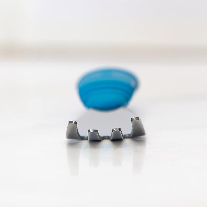 - TODDLER UTENSILS – This set is sized and shaped just right for self-feeding; concave stainless-steel fork and spoon heads help keep food on the utensils; outer fork tines are bent (like a spork) to help pierce solid foods and keep food on the fork