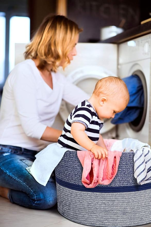 - 【Modern Design & Home Decor】 The woven storage basket can be used in every room. Their sleek, sophisticated shape and beautiful color navy blue and gray stitching will complement any decor. It can be placed for kindergarten, bedroom, bathroom, laundry room, balcony, etc.