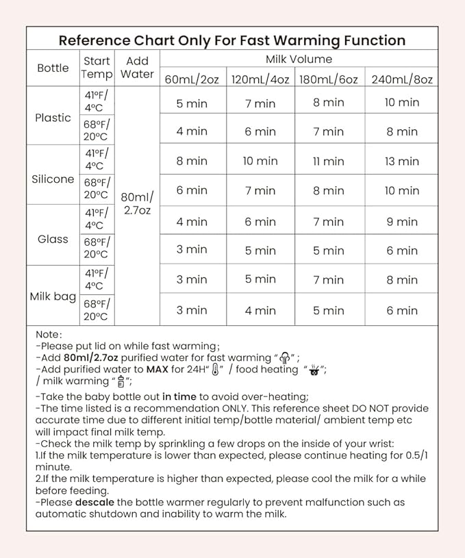 - 【Fast Warming in 3 Mins】 Takes only 3-7 minutes to heat cold milk to body temperature. It heats up quick enough to calm down a screaming baby in the middle of the night. Happy baby means happy mommy! It also comes with a sterili-zation function to deep clean bottles and nipples with steam. Such a great bonus for busy mom.