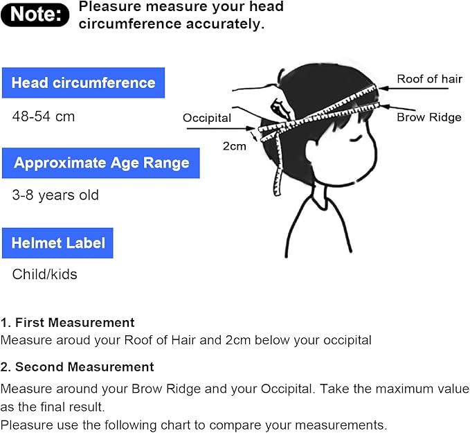 - Kids bike helmet: Suitable for 3-8 years old kids and toddlers with helmet size: 48-54 cm / 18.9-21.3". This kids bike helmet is easily adjustable for a snug fit, it could grow with your child for few years.