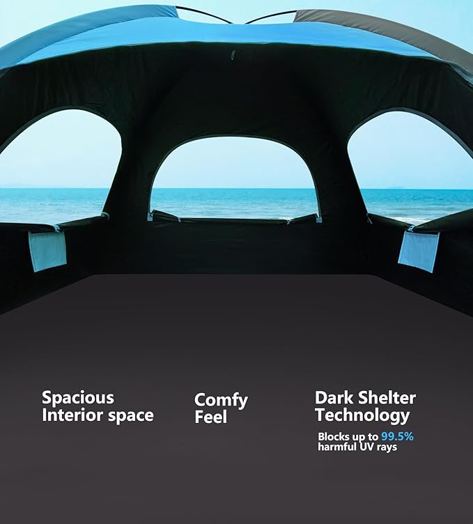- Outdoor Activities Protection & Great Ventilation - Premium 210D sun-proof materials, with embedded coated polyester lining within, are able provide great UV protection (UPF 50+) and reflect or block up to 98% of unhealthy UV rays. The 3 large mesh windows provide excellent airflow to keep the tent nice and chill inside. So you can feel the breeze from the ocean, stay cool in the summer heat wave, and enjoy a comfortable and cozy sun shelter with your family and friends.