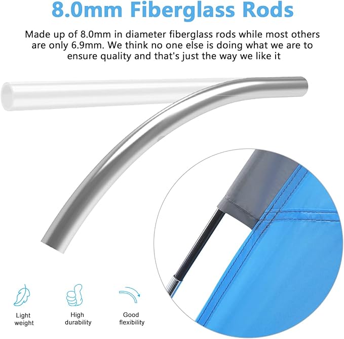 - Good Flexibility & Higher Durability - Fiberglass rods increased from 6.9 millimeter (market standard) to 8.0 millimeter for a more flexible and durable framework when installing in the shade. Dependable and reliable rods are essential, therefore we made this change in order to extend the rod’s lifespan, just to ensure our fiberglass rods can withstand multiple usage even after a long period of time.