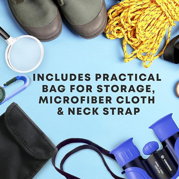 - ADVENTURE ACCESSORIES: These exciting binoculars come with a real compass and magnifying glass to encourage small kids to have adventures; Includes a practical cloth bag for storage, a microfiber cloth to clean the glasses, and a neck strap to secure the binoculars