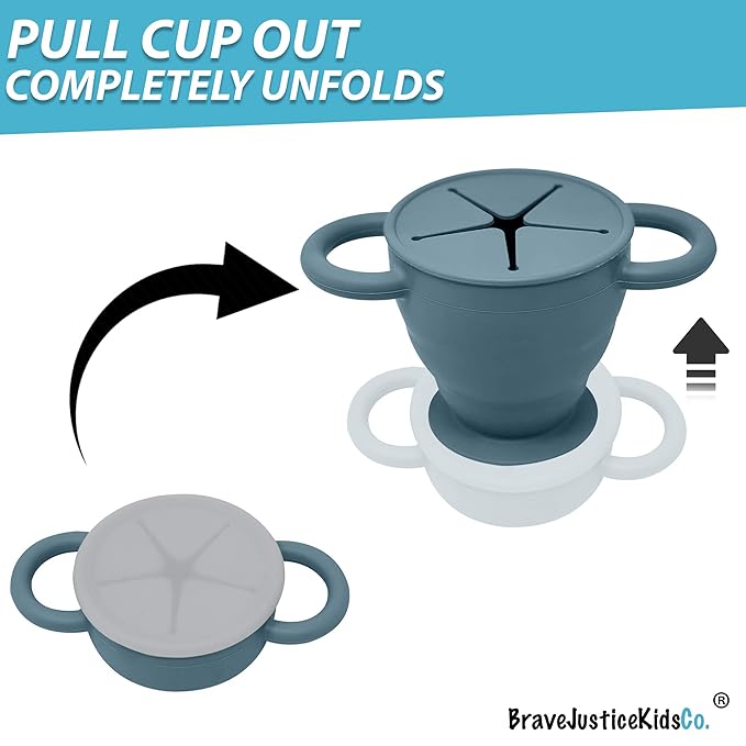 BraveJusticeKidsCo | Snack Attack II Snack Cup | Collapsible Silicone Snack Container | Toddler and Baby Snack Catcher Lid (Blue Steel)