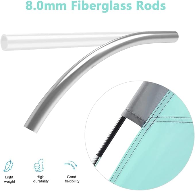 - Good Flexibility & Higher Durability - Fiberglass rods increased from 6.9 millimeter (market standard) to 8.0 millimeter for a more flexible and durable framework when installing in the shade. Dependable and reliable rods are essential, therefore we made this change in order to extend the rod’s lifespan, just to ensure our fiberglass rods can withstand multiple usage even after a long period of time.
