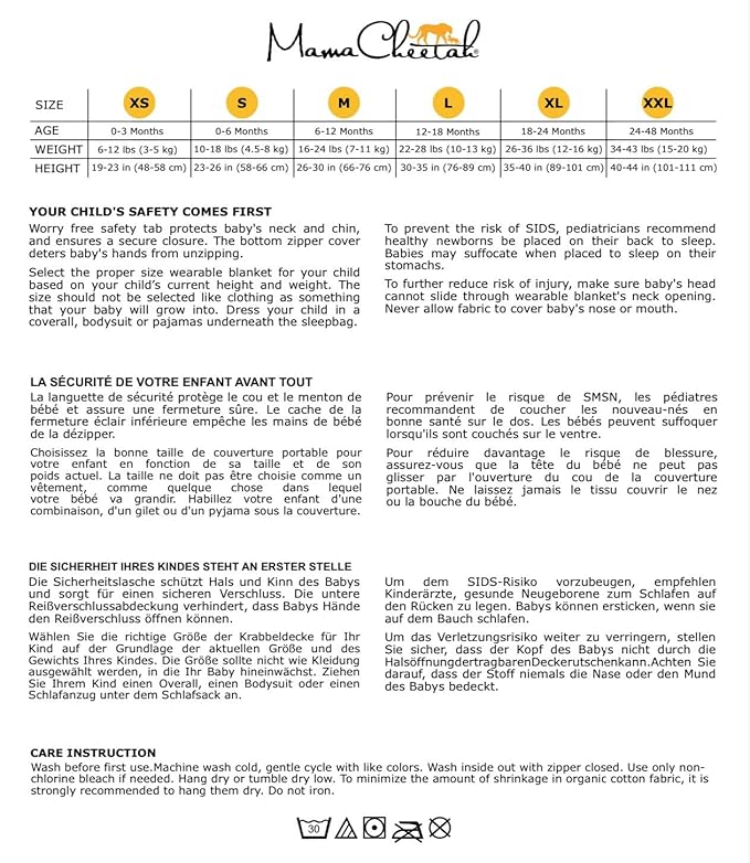 - Supersoft, light and breathable 100% organic cotton – The Mama Cheetah Wearable Blankets are made of supersoft, light and breathable premium organic cotton with a TOG rating of 0.5 to keep your baby warm, cozy, and sleeping peacefully. The light and breathable cotton interlock fabric minimizes the risk of overheating and keeps your baby comfortable.