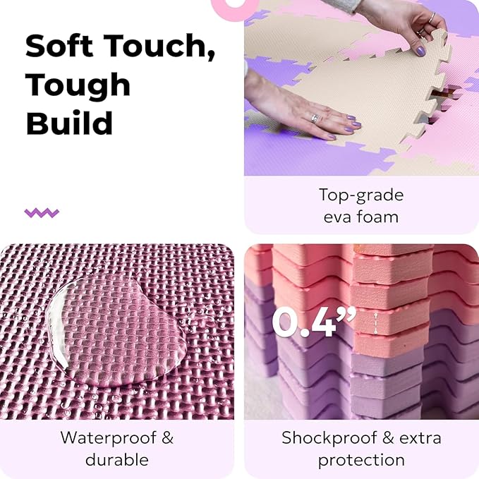 - 😴 EASY-TO-ASSEMBLE INTERLOCKING FOAM TILES: Our 12.4 x 12.4-inch interlocking foam tiles fit securely together, creating a customised play area for any room. Choose from our 16-piece set (covers 16 sq ft) or 36-piece set (covers 36 sq ft), each with matching borders for a polished look.