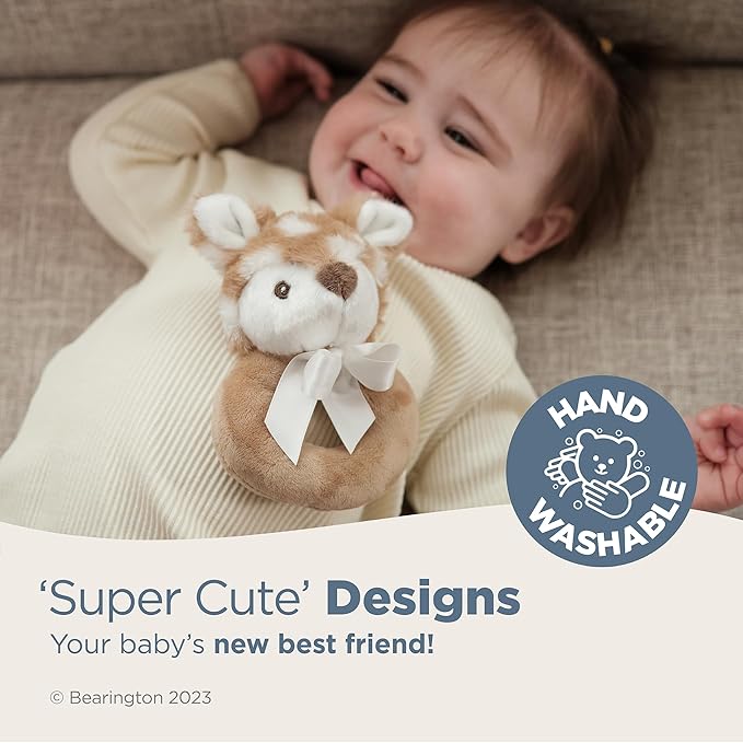 Bearington Collection Baby Lil’ Willow, 5.5 Inch Fawn Plush Stuffed Animal, Soft Baby Rattles and Plush Rings - Newborn Toys
