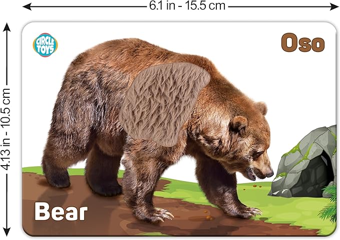 - Cards are safe, non-toxic, and waterproof. Texture is sturdy and smooth. Some of the pictures have a raised texture so children can associate sight and touch. For example, there is fur on part of the dog (perro) card so a part of learning can be a tactile experience.