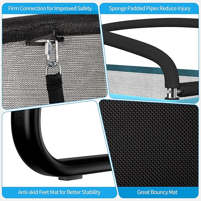 - Sturdy Structure: Constructed of sturdy 2 U-shaped galvanized steel frames, this safe trampoline is anti-rust for outdoor use and stable for safety. Moreover, it comes with strong loading capacity for different zones (220 lbs for trampoline and 110 lbs for swing).
