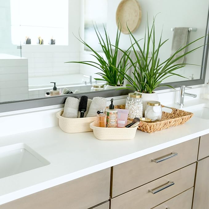 - 5 BASKETS FOR 5X THE ORGANIZING POWER: Life is messy...but your house doesn’t have to be! With 5 beautiful rope baskets for organizing, you’ll defeat messy rooms like a true supermom! Use the largest baskets for Montessori displays or countertop fruits holder, create the cutest dog toy storage or bathroom hand towel holder with the medium ones and stash jewelry or keys in the smallest. Biggest (11.8"x8.7"x4.3"), (11"x7.9"x3.9"), (10.2"x7.1"x3.5"), (9.1"x6.3"x3.1"), Smallest (7.9x5.5"x2.8")