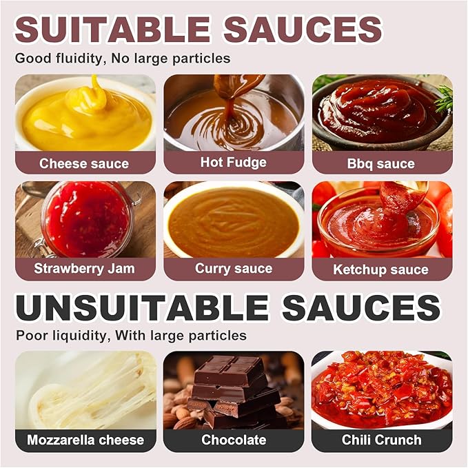 - 【VERSATILE USAGES】The warmer can not only be used for keep sauce warm, but also dispense warm sauces and decorate foods. Including nacho cheese, hot fudge, caramel, strawberry jam, peanut butter, popcorn butter,hot chili, curry, chocolate sauce, butter cheese etc..
