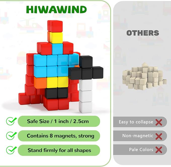 - Open-Ended Creative Building Toys : Unleash your child's creativity and engineering skills with Hiwawind magnet blocks. As kids explore structures of different levels of difficulty, they'll experience pure joy at every step of their building journey and turning toddlers' imagination into reality. Great building blocks for toddlers to foster their problem-solving abilities, spatial awareness and color coordination skills.