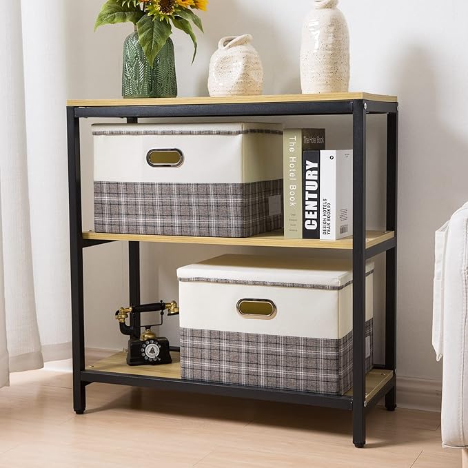 PRANDOM Large Collapsible Storage Bins with Lids [3-Pack] Fabric Foldable Storage Boxes Organizer Containers Baskets Cube with Cover for Home Bedroom Closet Office Gray plaid & Cream(17.7x11.8x11.8)