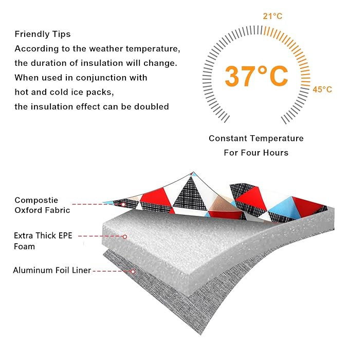 - HIGH QUALITY MATERIALS: Made of high quality water-resistant composite oxford fabric, 8mm extra-thick EPE foam and food-grade aluminum foil liner. No odor, non-toxic, food safe, durable, lightweight. Effectively keep bottles stay cold, warm or fresh for hours, it keeps breast milk fresh.