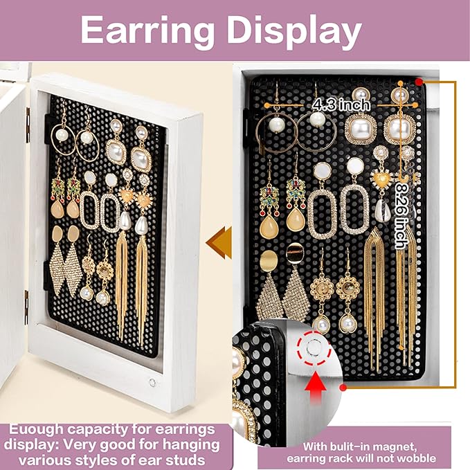 - ❤Large Capacity: The top layer has a built-in mirror and ring tray, 4 pull-out drawers keep your jewelry away from getting messed up, easily store different sizes of jewelry, even necklaces, bangles, and big earrings like hooped earrings. 2 side doors for hanging chunky necklaces and plenty pairs of earrings.