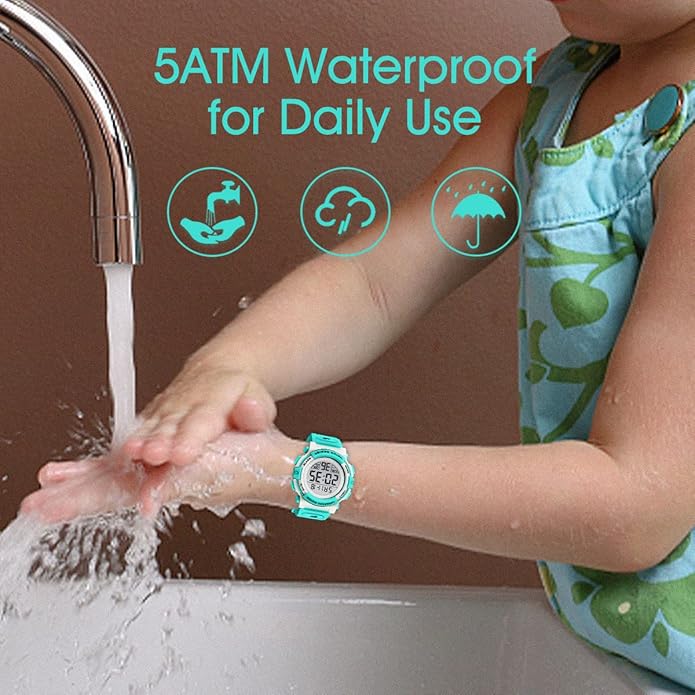 - 50M Waterproof Resistant: It has 50m(5ATM/150FT) waterproof performance, children wearing this waterproof watch can be splashproof and rainproof outdoors or playing, happy and free. Be careful the watches for kids not to operate the buttons in sauna, bathing, or diving.