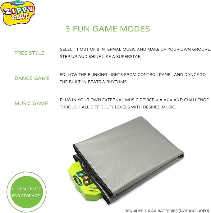 - 【DANCING GAME】Interactive dancing game with up to 8 levels of difficulty. Select desired game level with different music and follow indicating LED lights on control box to dance along. It might require both hands and feet to touch dance mat simultaneously at high level to score points. TV is no longer needed to play a dance mat. It comes with built-in AUX port for external music device to plug in. Kids may always keep up with latest dance tunes.