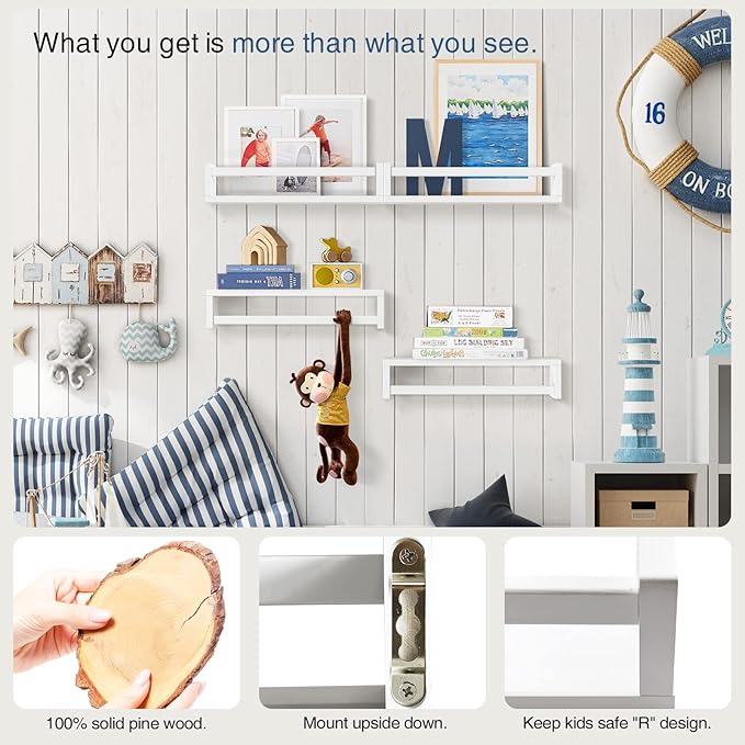 - [Great for Nursery and Kids Room] Mount these floating shelves on your nursery wall, Kids can stow books, toys, stuffed animals and games in wall shelving, where theyβll be off the floor and easy to reach.