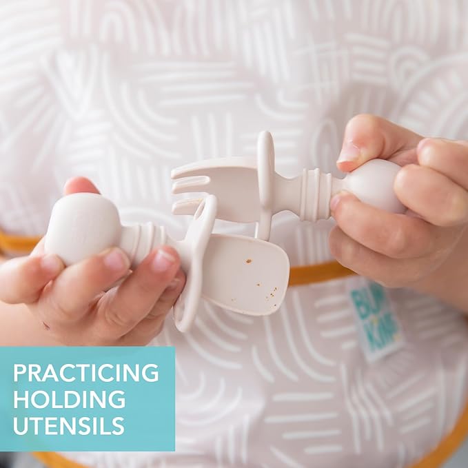 Bumkins Baby Utensils Set, Chewtensils Silicone Spoons for Dipping, Self-Feeding, Baby Led Weaning, Trainer Learning, First Stage Eating, Soft Practice Fork and Spoon, Babies 6 Months, Sand Beige