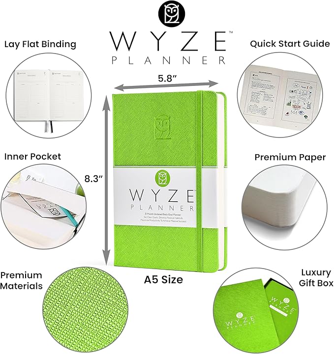 Undated Daily Planner – 3-Month A5 Productivity Organizer with Full Page Per Day, Hourly Schedule, Goal Setting, Habit Tracker, Weekly & Monthly Pages – Hardcover Time Management Notebook (Lime Green)