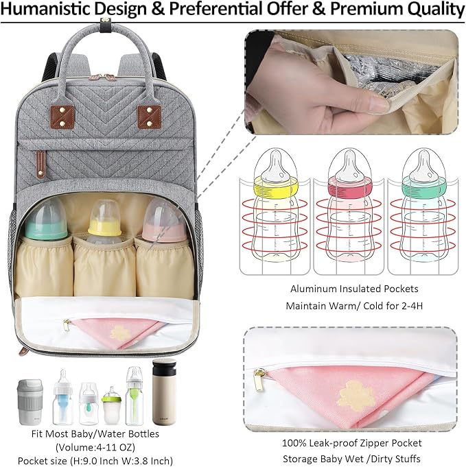 Diaper Bag Backpack Tote with Insulated Pockets for Men Baby Boys Girls Newborn Unisex Tactical Large Capacity, Multifunctional Waterproof Grey