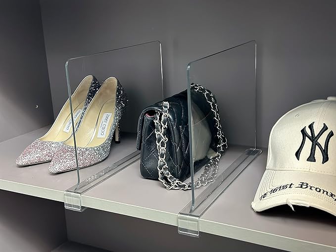 - WHY CHOOSE US:Made of high quality acrylic which has better ductility, lighter and safer than glass, wood or chrome closet dividers,unlike metal wire closet shelf divider,our dividers have not sharp corners,it will not scrape your shelves. And you need no tool installation! Just slips right on to your shelf