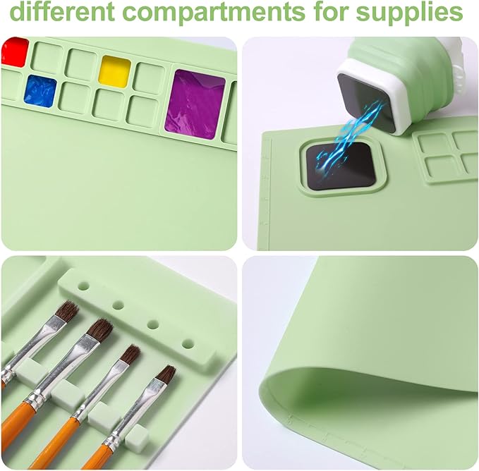 - [LARGE SILICONE MAT]: The size of the silicone artist mat with a water cup is 20×16 inches. The slightly raised edge keeps everything on the art mat.