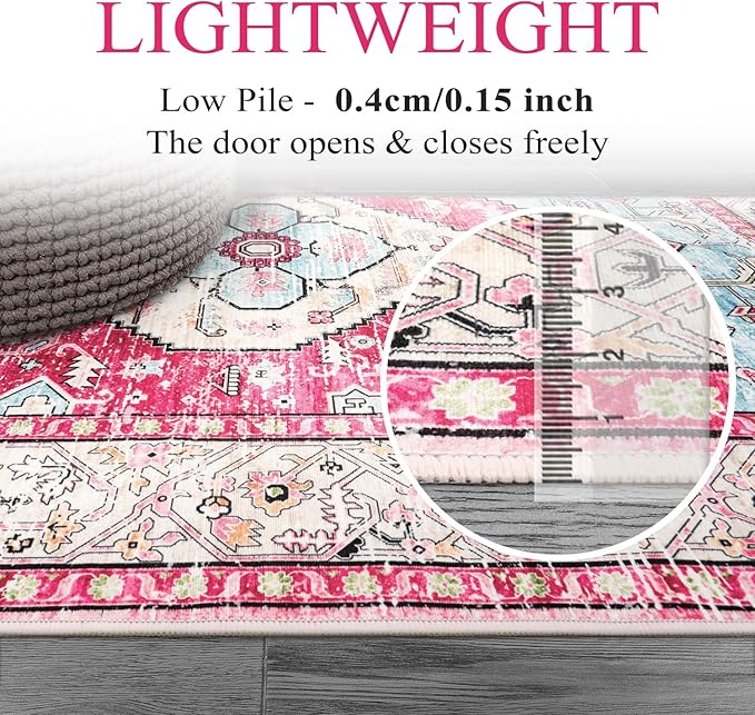 - Functional Lightweight Rug - Lahome ultra-thin rugs are made with everyday use in mind and high-traffic areas. 0.15 inches thickness allows for convenient placement in bedroom, kitchen, entryway and underneath furniture. The door opens and closes freely