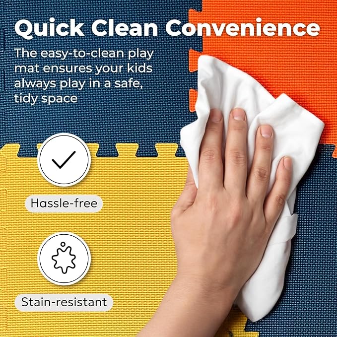 - 😴 EASY-TO-ASSEMBLE INTERLOCKING FOAM TILES: Our 12.4 x 12.4-inch interlocking foam tiles fit securely together, creating a customised play area for any room. Choose from our 16-piece set (covers 16 sq ft) or 36-piece set (covers 36 sq ft), each with matching borders for a polished look.