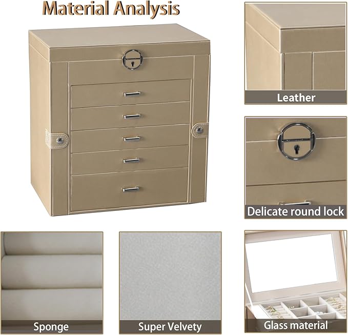 BOOVO Jewelry Box For women, 6 Layer Large Jewelry Organizer With Mirror, Multi-Function Storage Box With Lock, Accessory Holder With 5 Drawers, For Earrings Necklace Ring Bracelet (Pale gold)