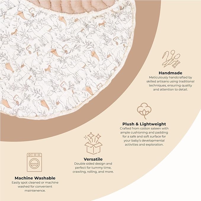 - MAGICAL PLAYMAT: Step into a magical forest with this woodland play mat, designed to stimulate your child's imagination and curiosity. This woodland tummy time mat is adorned with friendly foxes, wise owls, and cuddly bears, captivating your child's attention and fostering a love for nature.