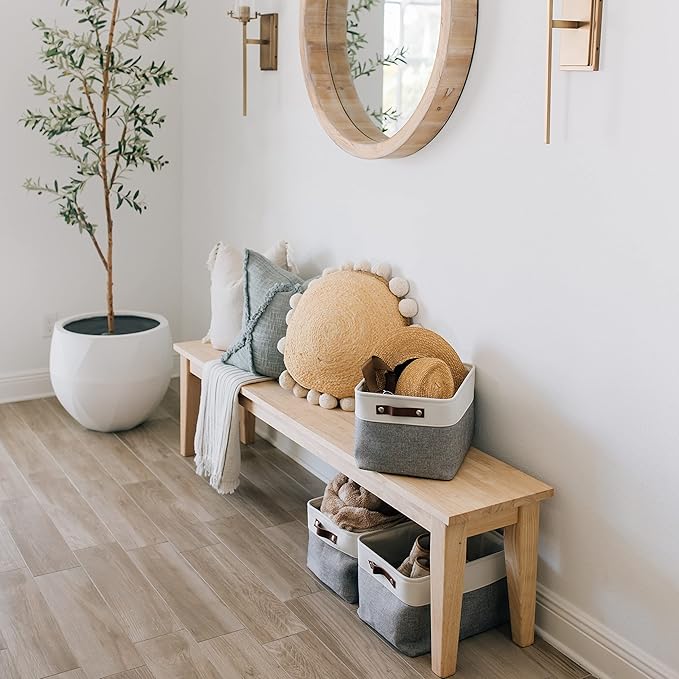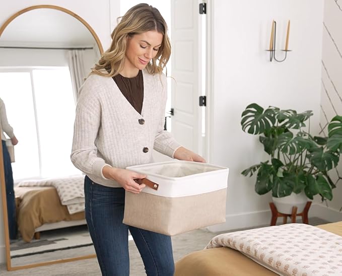 - Decorative Fabric and Vegan Leather – These versatile storage baskets for organizing your everyday life are made with a thick, high-quality fabric and fitted with leather handles to add a stylish touch to a living room, bedroom, office, or personal space.