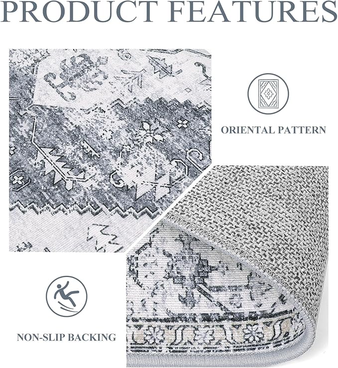 Lahome Boho Washable Rugs for Bedroom - 3x5 Area Rugs for Living Room Throw Non-Slip Thin Entryway Rug Kitchen Rugs Grey Oriental Distressed Print Capet for Office Bathroom Laundry Room Dining Room