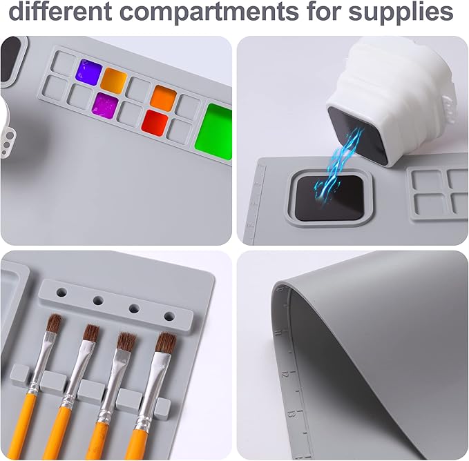 - [LARGE SILICONE MAT] - The size of the silicone artist mat with a water cup is 20×16 inches. The slightly raised edge keeps everything on the art mat.