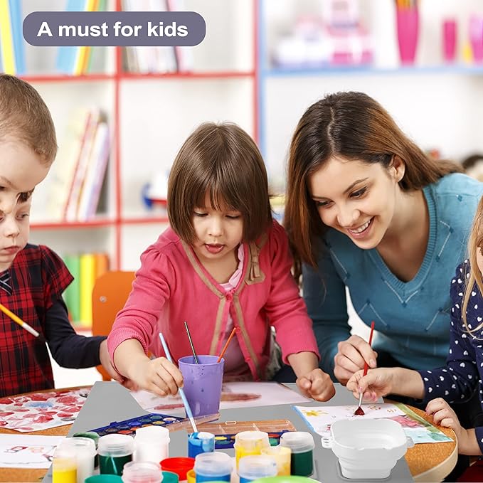 - [UNIQUE DESIGN] - Silicone painting mat has a collapsible attached cup with brush holders on the side and top, built-in paint wells, and brush rests. Keep clean while creating efficiently.