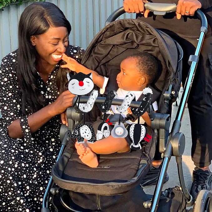 - √ Black and White Toys: The musical car seat toy is made of premium quality soft cotton plush, fabric and plastic, design in high contrast black and white colors and cute fox, elephant, cloud, hot air balloon, flower teether shape, baby will be attracted and love it.
