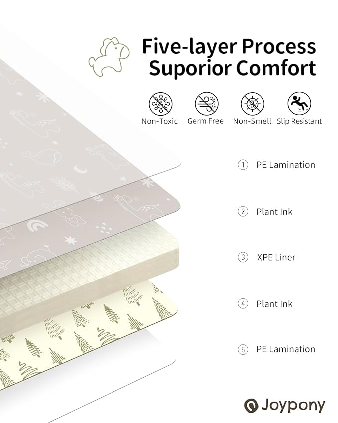 - [SAFETY & COMFORT - FOREMOST PROMISE] - Made from high-density XPE foam material, our baby play mat is BPA-free, non-toxic, and no chemical smell, ensuring a soft and safe play surface for infants and toddlers. Its cushioned design is perfect for protecting little ones from hard floors and providing extra support during tummy time. Joypony play mat is truly reliable, safe and and is ready to use right out of the box.