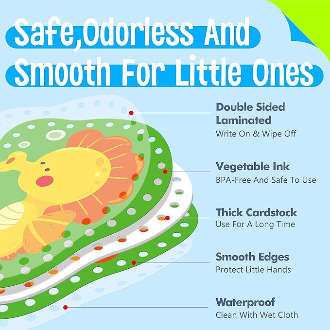 - Premium Material: The lacing cards are made of sturdy cardstock, durable and handy. Double side printed with premium plant ink, non-toxic and no odd smell, safe enough for toddlers’ use. The laces are made of quality polyester, which is not simple to break, and can serve you for a long time.