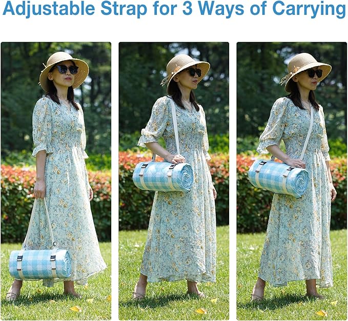 - HIGH QUALITY FABRIC: The top fabric is made of durable polyester, and printed with classic neutral blue white check, the color printed is safe and fastened, not easy to fade as time goes. The soft cotton padded in the middle, making the picnic blanket soft and comfortable to sit and lie down.