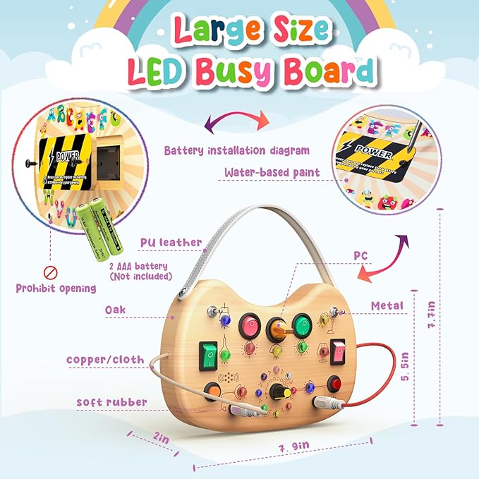 - Creative development : Baby wooden busy board is designed to stimulate children's cognitive abilities and fine motor skills, switch busy board comes with a wealth of ways to play, Flycoost sensory toys can exercise baby's thinking skills and hands-on skills, you can let your little one play for hours to keep their hands and brains busy, is a gift for children at different stages (such as 1 2 3 4 years old ideal gift), please bring your own 2 AAA batteries before use.
