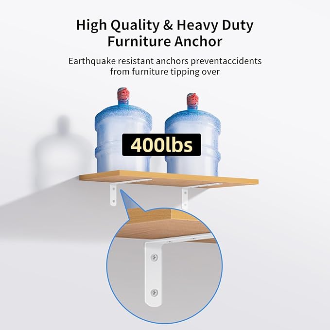 - 【Maximum Stability for Child Safety】:Includes 4 furniture anchors designed to resist up to 400 lbs force, effectively preventing furniture tip-overs and safeguarding curious toddlers around cabinets, dressers, and bookshelves.