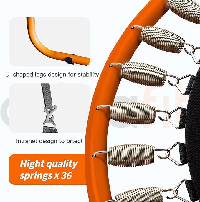 - Super Bouncy: Jumping is joy. With 36 springs, the Ativafit trampoline is super bouncy for an exhilarating jumping experience. The high-quality springs ensure long-lasting performance. Also we have a intranet design to prevent springs showing out. And the U-shaped legs design for stability prevening moving around when your kids jumping on this trampoline.