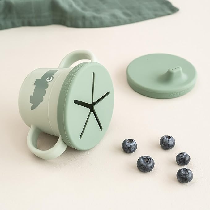 - 3-in-1 cup with a snack and a spout lid in soft silicone that you can easily switch between.
