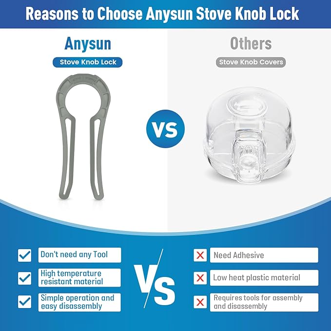 - Keep your kids safe: Use the Anysun stove knob cover lock. In this way, the baby does not open the gas stove switch to avoid accidents. Our functional design stove knobs effectively prevent babies from opening gas stoves to protect children from burns, scalds, gas leaks, and other accidents.