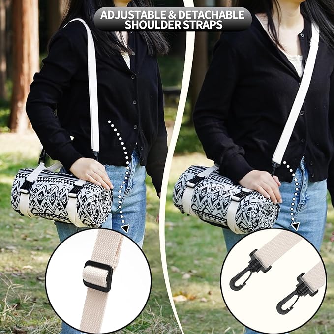 - ADJUSTABLE SHOULDER STRAPS - The portable picnic blanket can be carried easily by hand, on either shoulder by adjusting to the proper lengths, so you can carry other picnic suppliers with the other hand,the handle strap with double ring buckle is convenient to carry, and can easily fold and fix the picnic mat,so if you don't fold it exactly as originally packed, it will fit anyway,saving a lot of space on the travel.