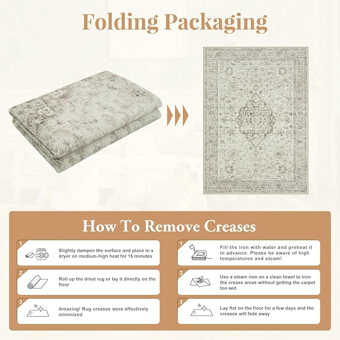 - Folding Packaging--Due to the folding during packaging, the taupe area rug may have some creases upon opening. However, the edges are resistant to buckling, and the folds will disappear once the rug is laid flat and ironed.